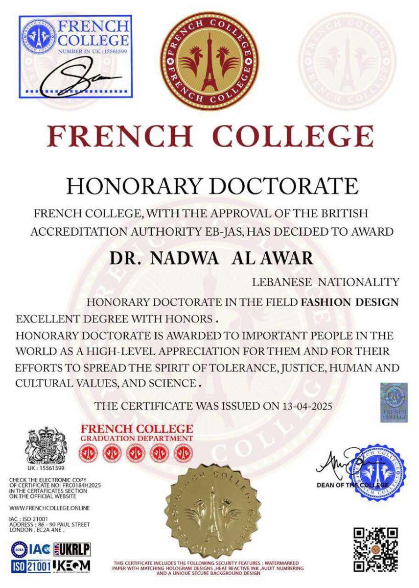 لذلك، تم “منح الدكتورة ندوى الأعور، لبنانية الجنسية، دكتوراه فخرية في مجال تصميم الأزياء، بدرجة امتياز مع مرتبة الشرف”.