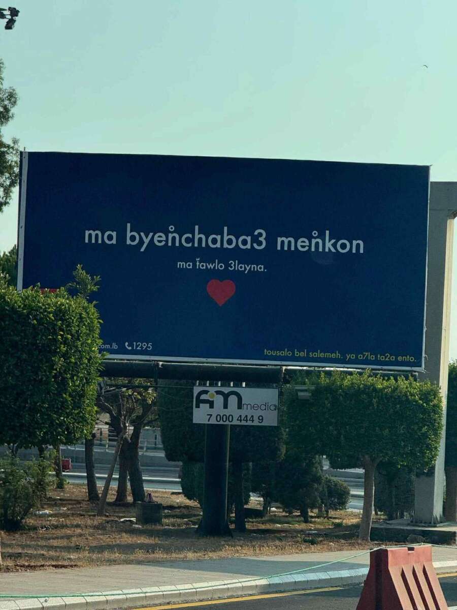 عند معبر المُغادرين على مدخل مطار رفيق الحريري الدولي ببيروت، ترتفع لوحة بلون السماء، كأنّها تنادي العائدين والمغادرين على حدّ سواء: “ma byenchaba3 menkon ma tawlo 3layna”.. أو “ما بينشبع منكم، ما تطوّلوا علينا.”