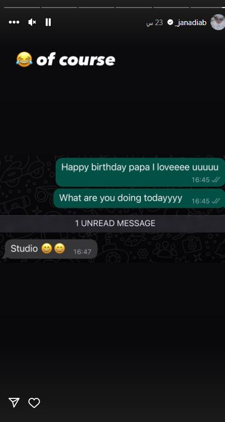وفي التفاصيل، نشرت جانا عبر خاصية القصص القصيرة على حسابه الرسمي عبر انستغرام صورة لها عندما كانت طفلة برفقة والدها وعلّقت على الصورة: “يوم ميلاد سعيد بابا”.